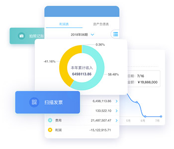小程序 1、隨查隨用,掃描發票、拍照智能記賬 2、碼上分享:實時分享報表數據,便于內、外部協同 | APP 掃描發票、拍照智能記賬,智能語音查詢數據,經營狀況一目了然 | WEB 全面企業財務管理功能,多人同時記賬,高效協同,數據共享 |